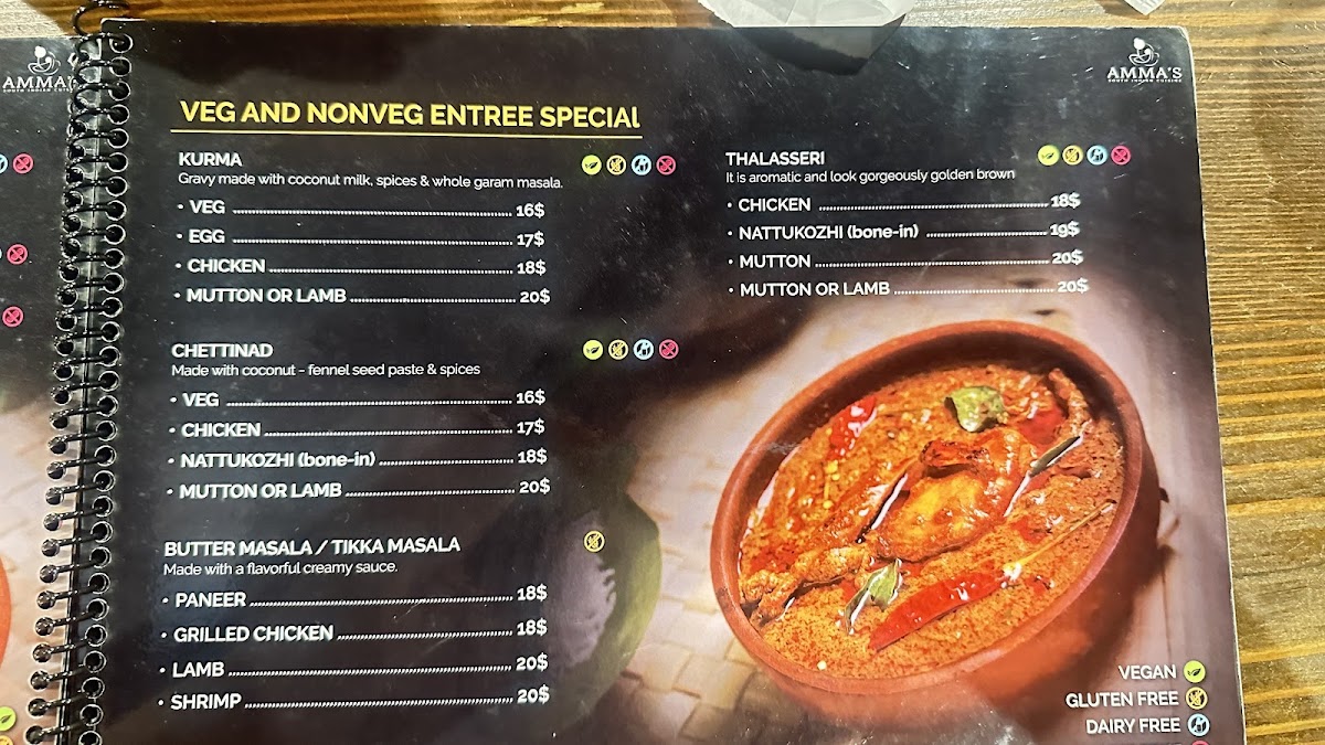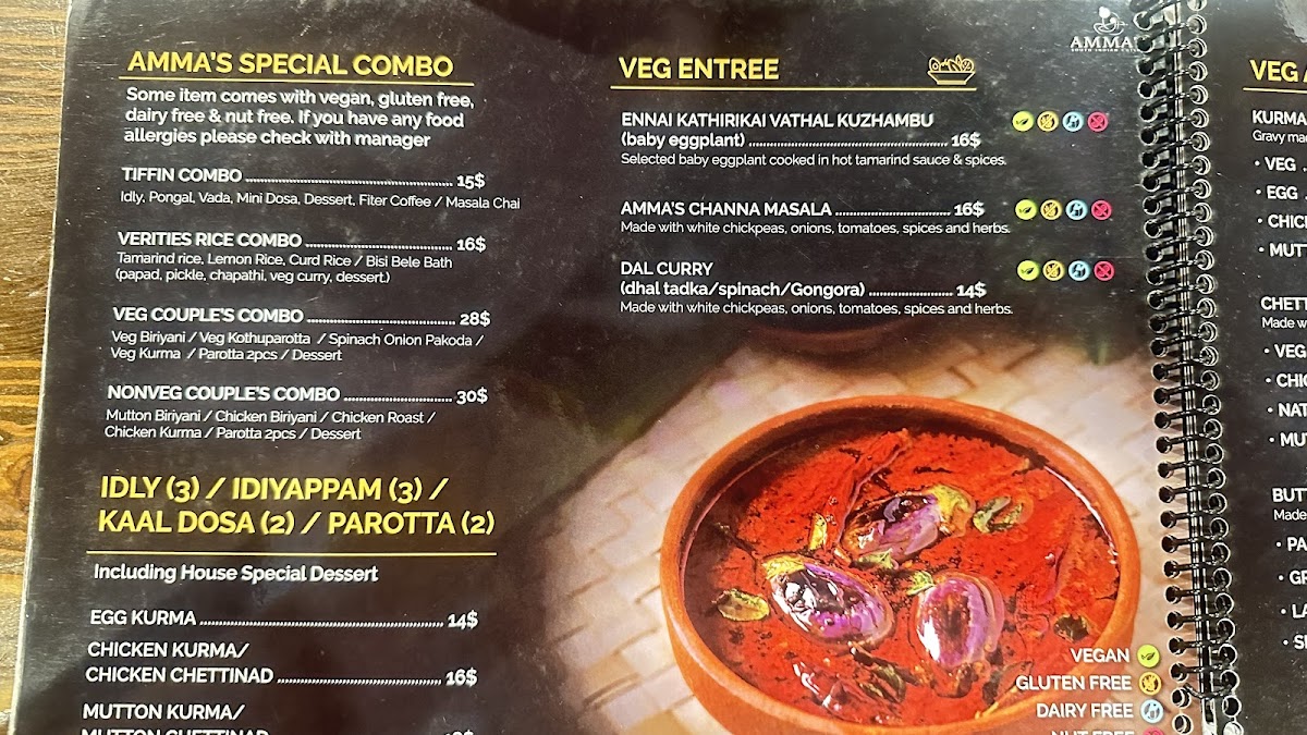 Vegetarian offerings like Ennai Kathirikai Vathal Kuzhambu and Amma's Channa Masala showcase richly spiced, vibrant preparations that remain gluten-, nut-, and dairy-free, catering thoughtfully to diverse dietary needs. The Vindaloo varieties—chicken, mutton, lamb, and shrimp—offer tangy, robust flavors that reflect true regional roots without heaviness. Customer favorites like crisp dosas with fresh chutneys and comforting sambar capture the essence of homemade South Indian cuisine. Amma’s is a place where the food feels crafted with care, serving both nostalgia and discovery in every bite.